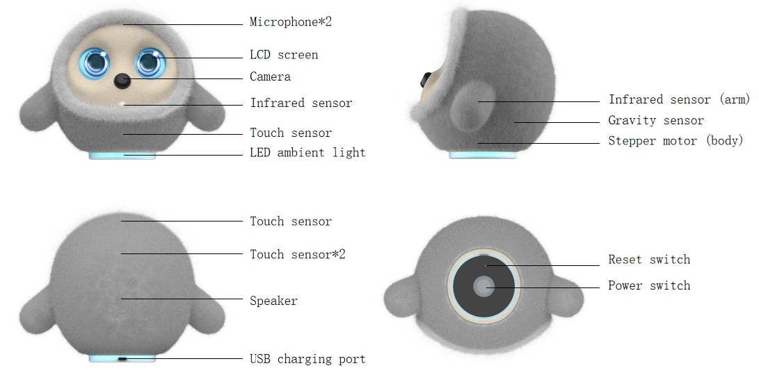 | এলসিডি এক্সপ্রেশন স্ক্রিন | 4.28-ইঞ্চি LCD স্ক্রিন (চোখ), গতিশীল এক্সপ্রেশন ডিসপ্লে এবং বাইনোকুলার ডিসপ্লে সমর্থন করে (যেমন চাক্ষুষ প্রতিক্রিয়া যখন "মৃত খেলা" বা "চতুর অভিনয়")। |