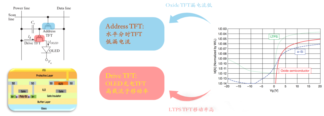 2018 সালে Apple-এর LTPO প্রযুক্তির প্রবর্তন উভয়ের সুবিধাগুলিকে একত্রিত করে, LTPS এবং IGZO TFT-কে একীভূত করে ডায়নামিক রিফ্রেশ রেট সমন্বয় সক্ষম করে, উল্লেখযোগ্যভাবে স্ক্রীন পাওয়ার খরচ কমিয়ে দেয়। এটি তখন থেকে হাই-এন্ড AMOLED ডিসপ্লেগুলির জন্য একটি স্বাক্ষর প্রযুক্তিতে পরিণত হয়েছে৷
